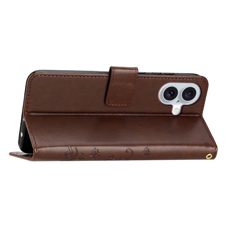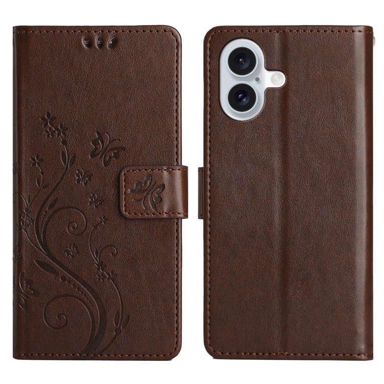 Detta plånboksfodral för iPhone 17 är tillverkat av PU-läder med ett slitstarkt innerhölje i polykarbonat för pålitligt skydd i vardagen. Den bruna designen har en elegant prägling med fjärilar och blommor på framsidan och insidan.