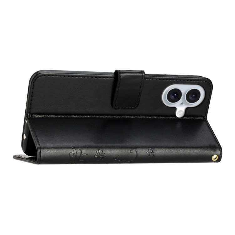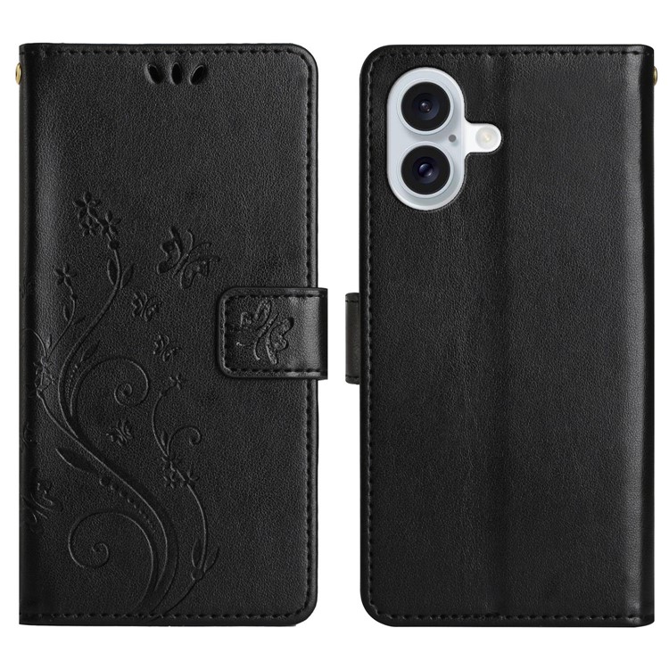 Framsidan har ett präglat fjärils- och blommotiv, medan insidan rymmer praktiska fack för kort och kontanter. Stativfunktionen och handledsremmen gör användningen smidig hemma och på språng.