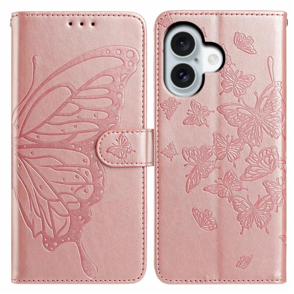 Skydda din iPhone 17 med ett roséguldfärgat plånboksfodral med präglat fjärilsmotiv. Utsida i PU-läder och insida i stöttålig TPU dämpar vardagsslitage och stötar.