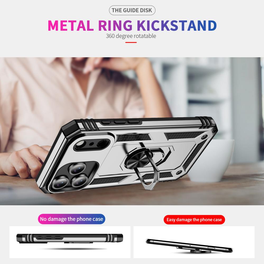 Den integrerade 360° roterbara metallringen fungerar som praktiskt stativ och ger bättre grepp. Inbyggd metallplatta möjliggör användning med magnetiska bilfästen, och precisa utskärningar ger enkel åtkomst; uppfyller militärklassad fallskyddsstandard. Observera att slutgiltig passform bekräftas först vid enhetens lansering.