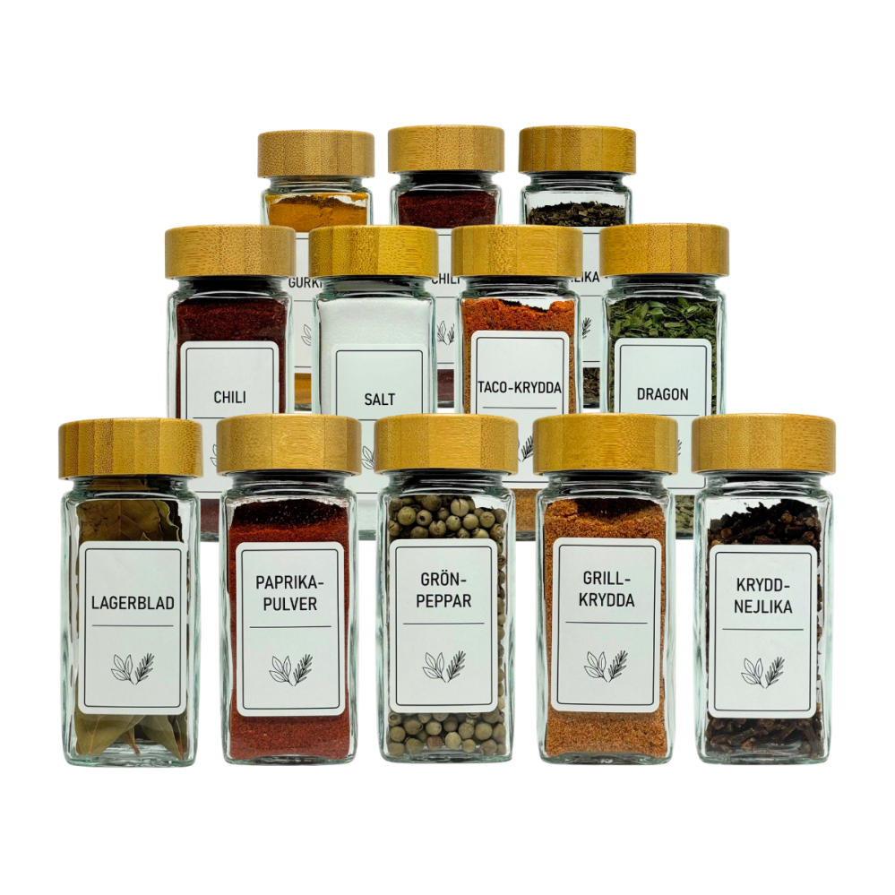 Kryddburkar i glas 12-pack med Bambulock – Svenska etiketter