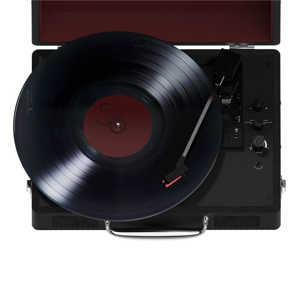 Den hållbara väskan låter dig ta med denna skivspelare var som helst, och 45 RPM-adapter är integrerad.
