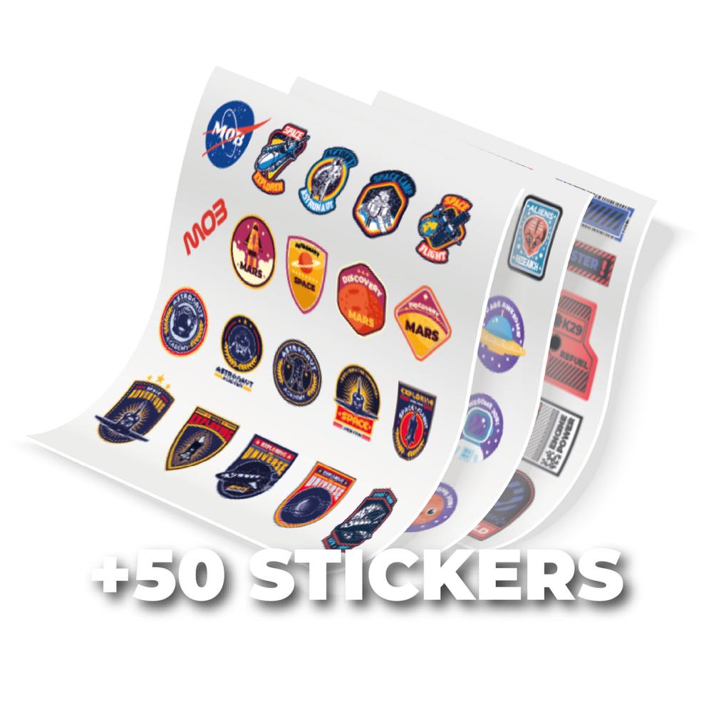 - Inkluderar 50 anpassningsbara klistermärken