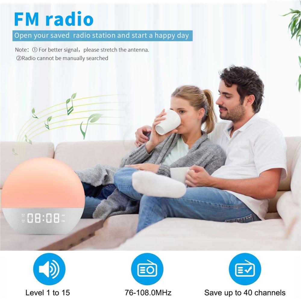 Utöver soluppgång erbjuds ett solnedgångsläge som hjälper dig att slappna och och somna lugnt, medan FM-radion håller dig uppdaterad med dina favoritstationer.