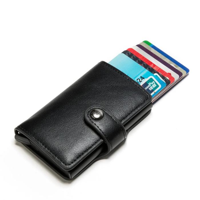 Vår korthållare har en unik funktion som låter dig skjuta ut dina kort i en överlappande sekvens genom att enkelt skjuta en spak åt sidan. Detta gör att du snabbt kan hitta och använda det kort du behöver utan att riskera att dina andra kort blir lästa av obehöriga.