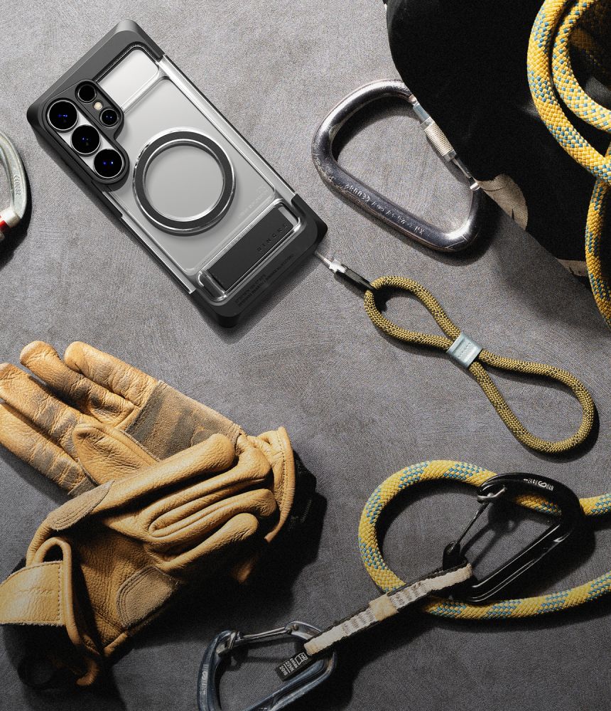 Den inbyggda magnetringen ger stabil fästning av kompatibla magnettillbehör och möjliggör trådlös laddning. Det integrerade stället vinklar telefonen både horisontellt för tittande och vertikalt för samtal, medan höjda kanter runt skärm och kamera ger extra skydd. Exakta utskärningar säkerställer enkel åtkomst till alla funktioner för en sömlös upplevelse med din Samsung-telefon.