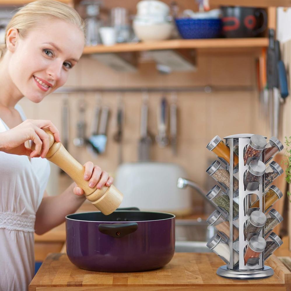 Platsbesparande design: Kompakt design sparar bänkutrymme - en bonus i mindre matlagning utrymmen. Roterande bas gör det enkelt att hitta den krydda du behöver och bevara värdefullt bänkutrymme.