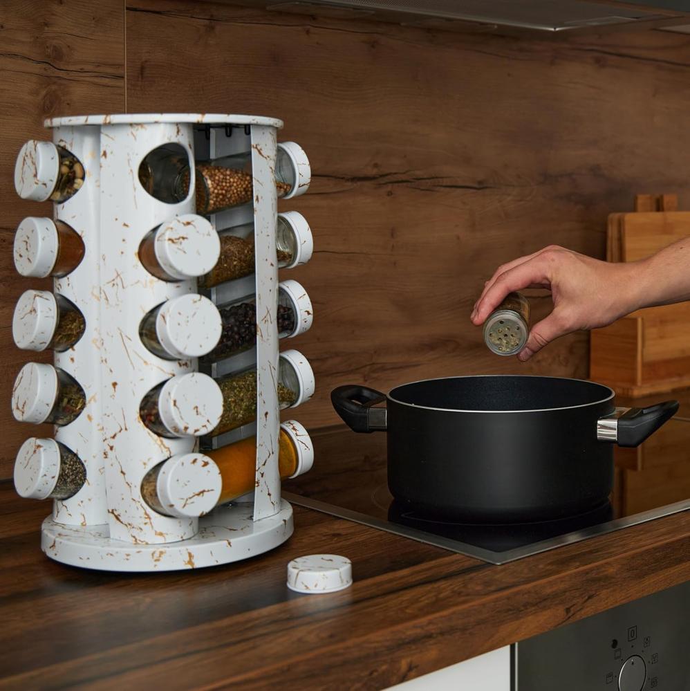 Roterande kryddställ med 20 glasburkar - Vit Marmor (Vit Marmor)