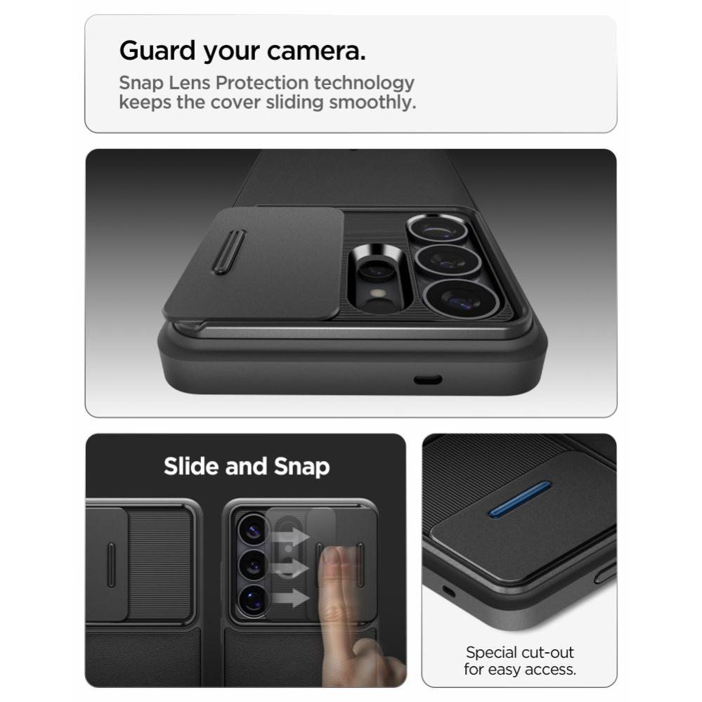Skydda telefonen mot vardagens smällar med ett hybridskal som förenar säkert kameraskydd och effektiv stötdämpning. Den integrerade, skjutbara linsluckan skärmar av objektiven från repor och damm och öppnas snabbt när du vill fota. Flexibel TPU runt kanterna samarbetar med ett tåligt polykarbonatreglage för ett tryggt, heltäckande skydd från Spigen.
