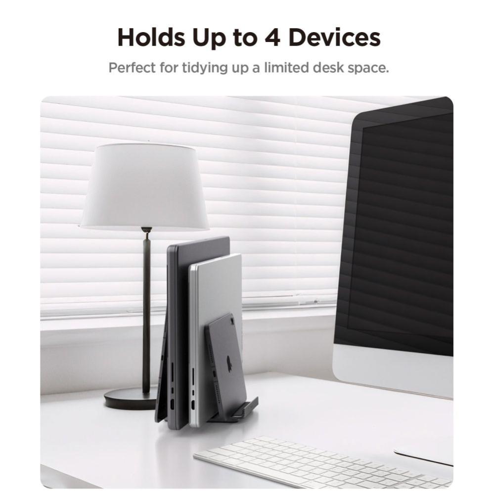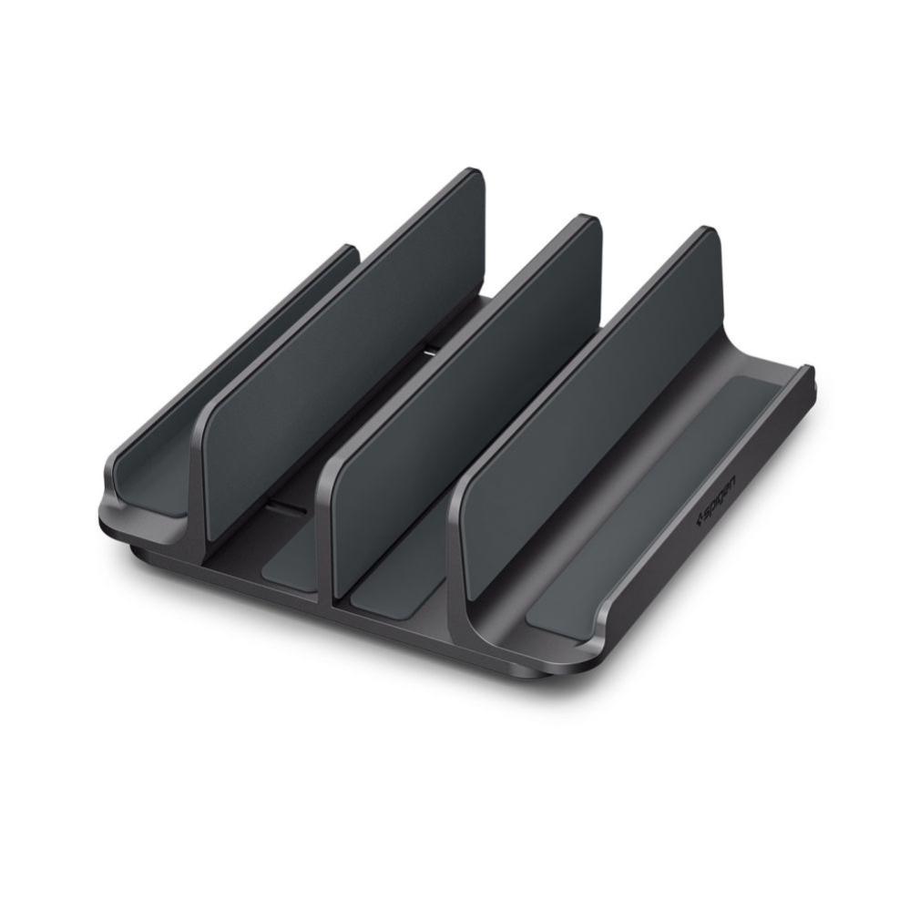 Vertikalt laptopstativ som frigör värdefull arbetsyta och organiserar upp till fyra enheter på höjden, med individuellt justerbara fack och stabil aluminiumkropp från Spigen.