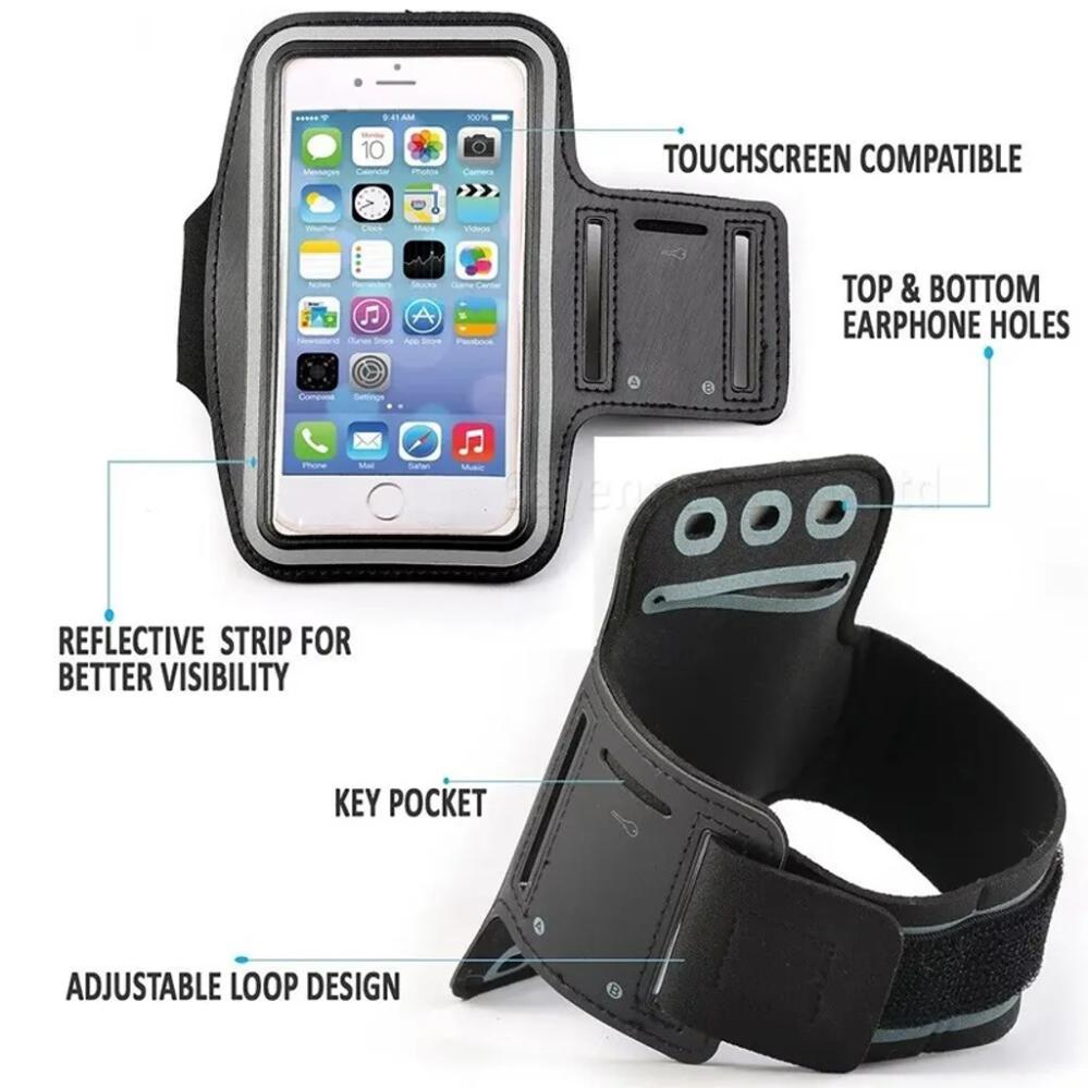 Armbandet har en justerbar låsning med kardborrband. Transparent framsida gör att du kan hantera skärmen, t.ex. byta musik, även när mobilen ligger i armbandet, samt smidiga hål på baksidan utav armbandet där du kan dra igenom sladd till t.ex hörlurarna.